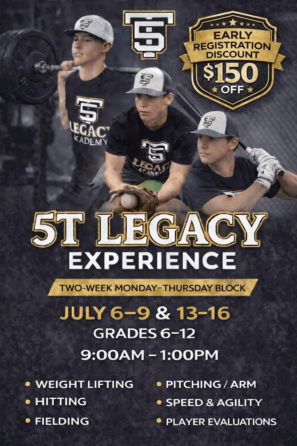At 5T Legacy Academy, we develop the complete baseball player — in the classroom, in the weight room, and on the field. Beginning Fall 2026, our program provides baseball players in grades 6–8 (including hold-backs) with an alternative to the traditional school day, combining structured academic time with high-level baseball training in a focused, disciplined environment designed for long-term development. Legacy Academy is not a school. Families are responsible for enrolling their student in an accredited homeschool program that best fits their academic needs. Our program is designed to complement that education by providing structured academic time each day along with tutor support multiple days per week to help students stay on track with their coursework while training. If you have any questions about how the academic structure works within Legacy Academy, please reach out to our Academy Director, Jay Pryor, at jay@5tlegacyacademy.com